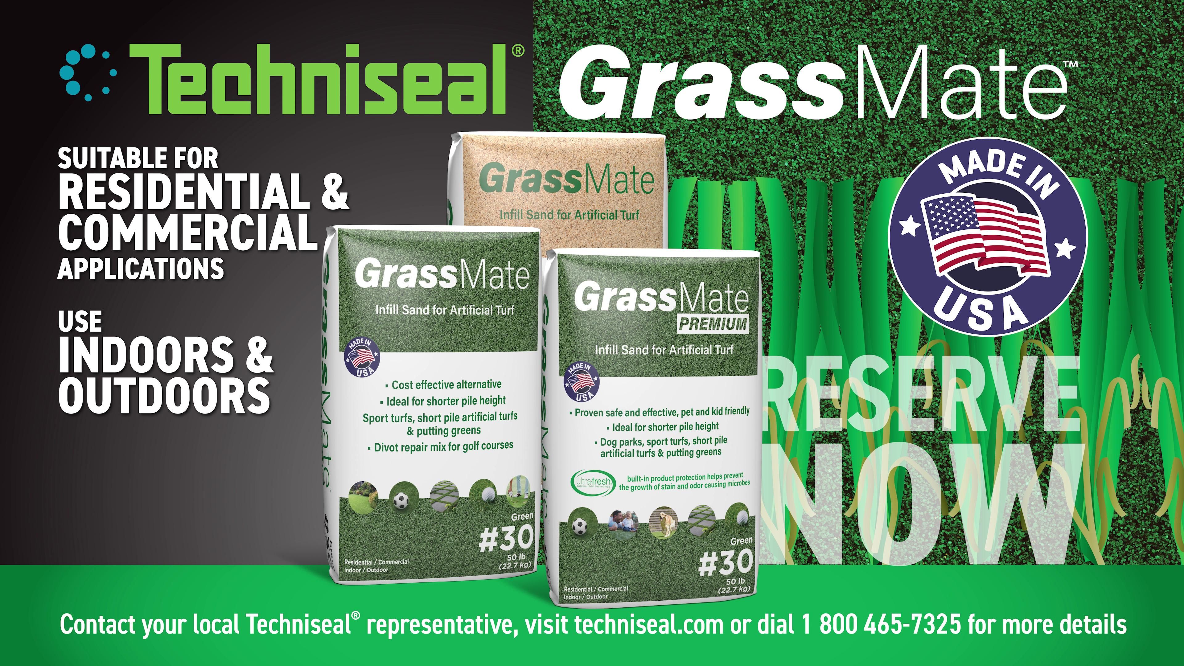 Green color, Standard #16-grade GrassMate™ from Techniseal is the solution for artificial turf and divot repair, consisting of acrylic-coated high-purity industrial quartz sand. It can be used primarily as infill sand for synthetic turf.
