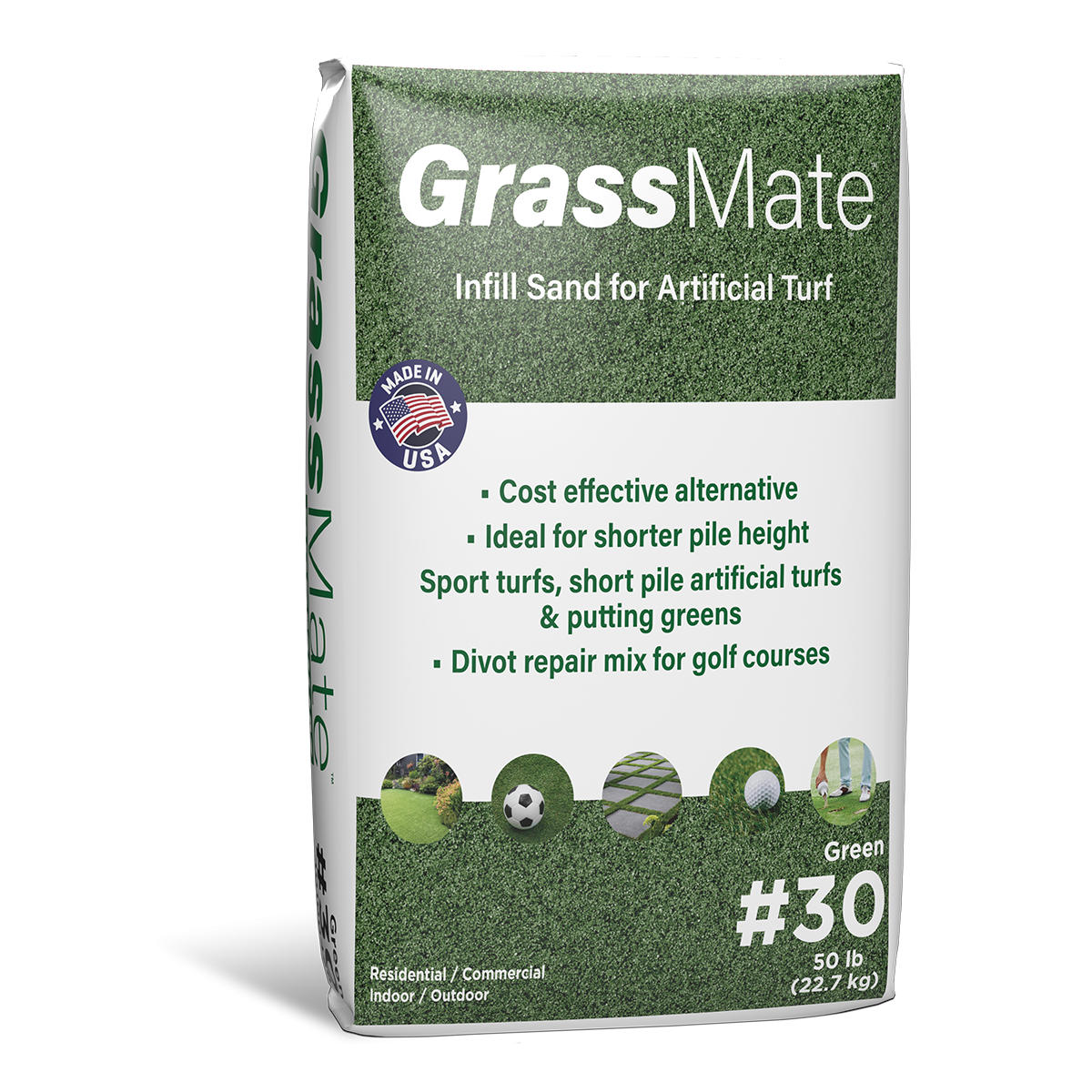 Green color, Standard #30-grade GrassMate™ from Techniseal is the solution for artificial turf and divot repair, consisting of acrylic-coated high-purity industrial quartz sand. It can be used primarily as infill sand for synthetic turf.