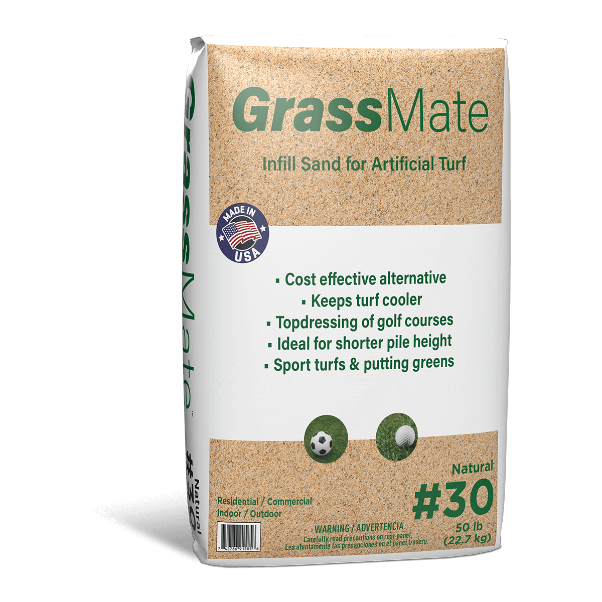 Natural color, Standard #30-grade GrassMate™ from Techniseal is the solution for artificial turf and topdressing of golf courses, consisting of acrylic-coated high-purity industrial quartz sand. It can be used primarily as infill sand for synthetic turf.