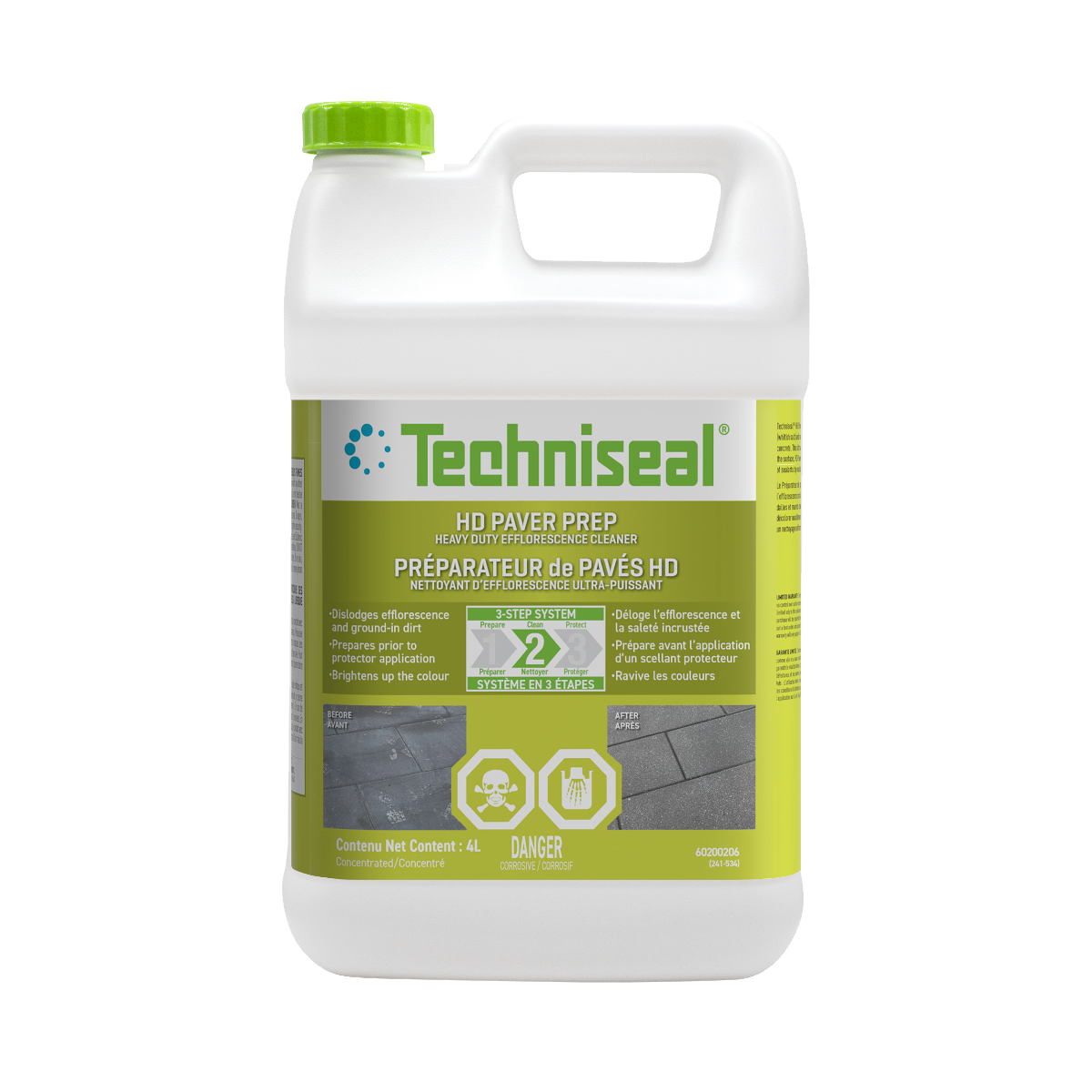 Le Préparateur de Pavés HD de Techniseal® est spécialement conçu pour dissoudre l’efflorescence coriace (sel blanchâtre) et enlever la saleté incrustée (traces causées par le passage des voitures, etc.) sur les pavés, dalles et murets de béton. Cette formule ultra-puissante agit en profondeur sans décolorer ou abîmer la surface. Le préparateur de pavés HD ravive la couleur, assure un nettoyage uniforme et permet au scellant de mieux pénétrer le matériau.