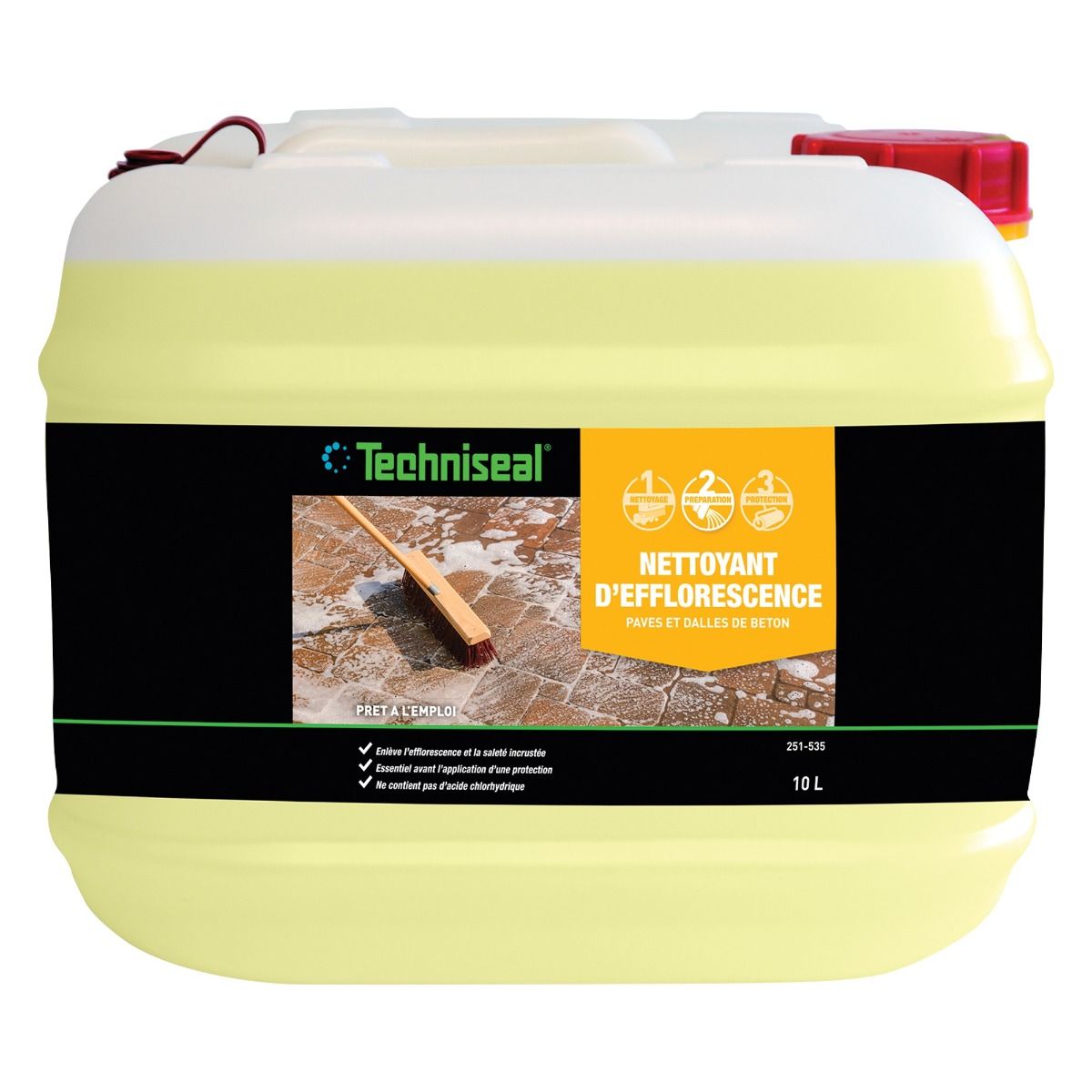 Le nettoyant d’efflorescence Techniseal® est spécialement conçu pour dissoudre l’efflorescence (sel blanchâtre) et enlever la saleté incrustée (traces causées par le passage des voitures, etc.) sur les pavés, dalles et murets de béton.