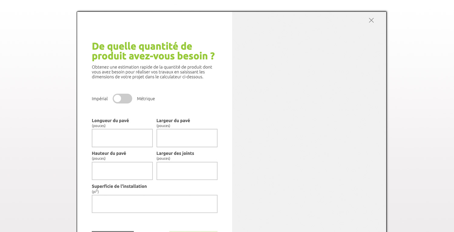 Toujours aussi rapide et facile à utiliser, l’outil offre désormais une estimation plus précise du nombre de sacs nécessaire pour compléter une installation de pavé uni en zone résidentielle, commerciale, ou dans le cadre d’un projet dans l’espace public.